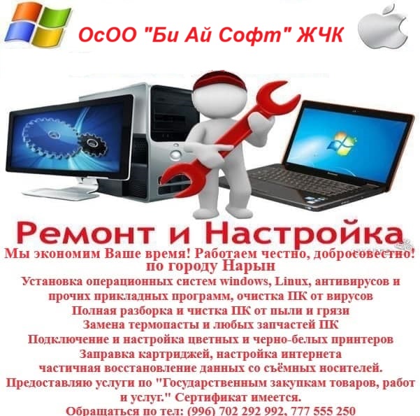 Приедем в офис, если случились неполадки. География выездов – г. Нарын.
